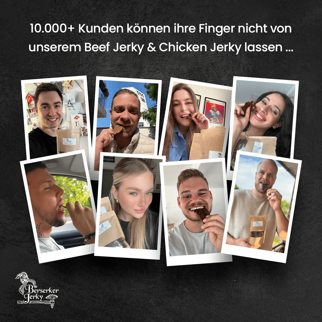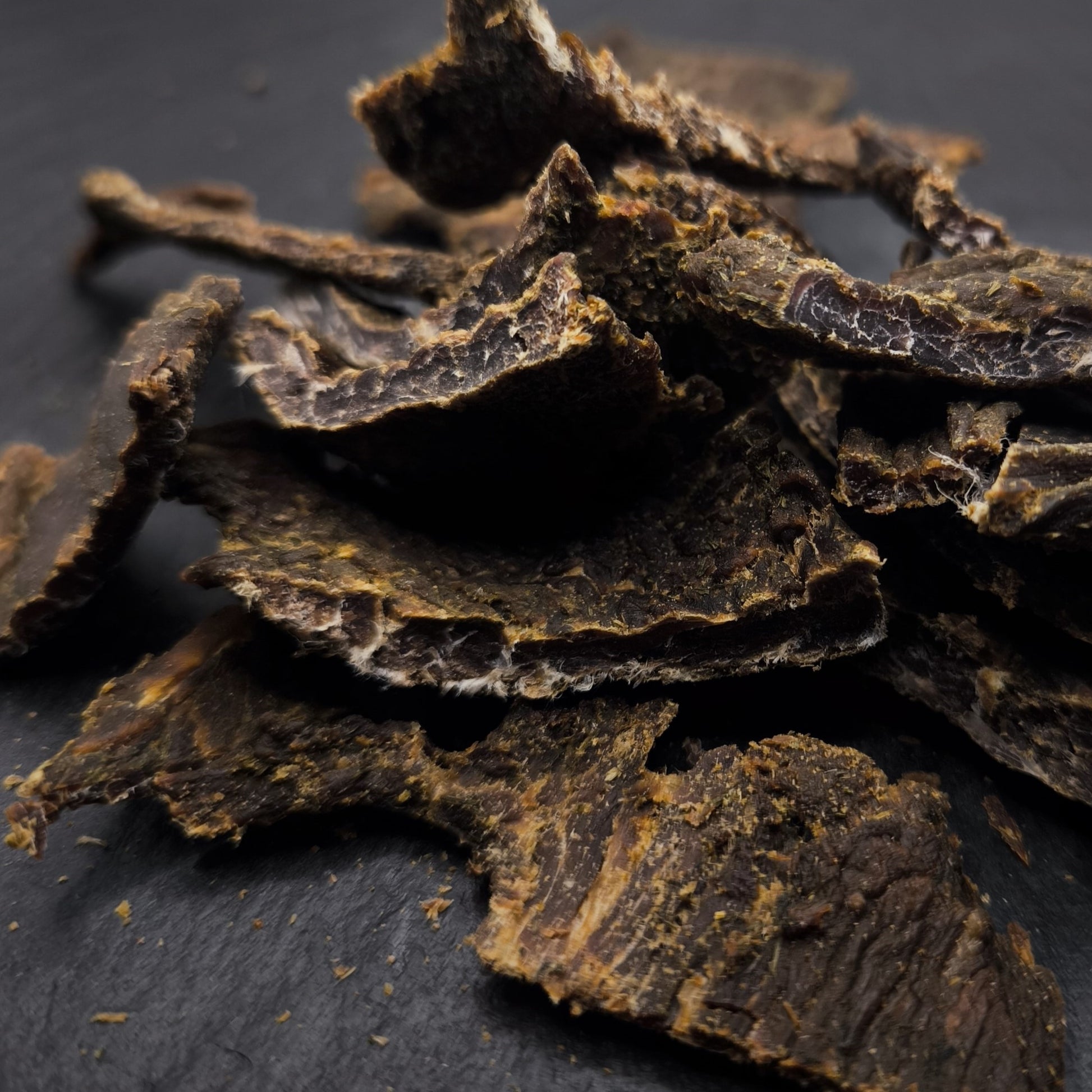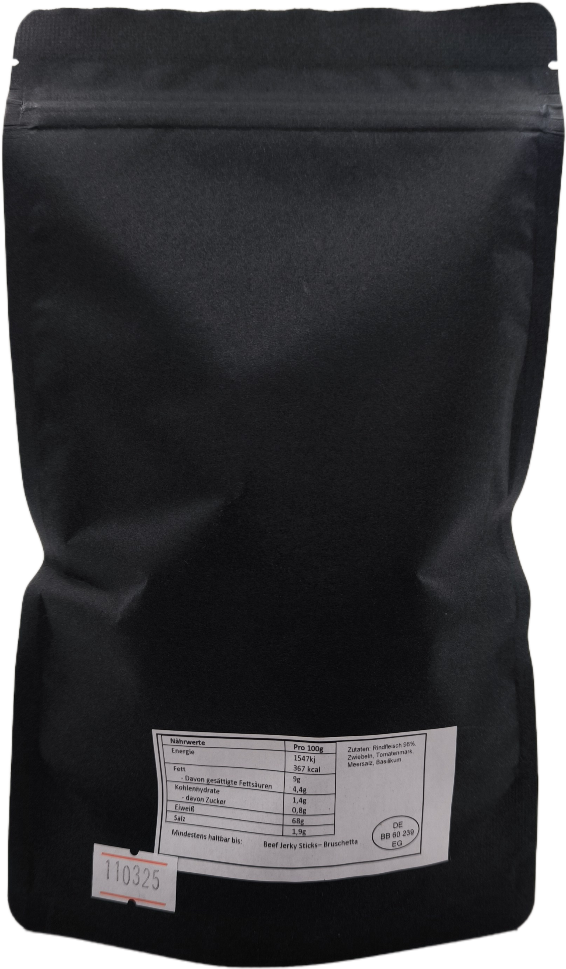 Unsere Sticks bestehen aus dickeren, Jerky-Stücken, die nicht nur geschmacklich überzeugen, sondern auch eine angenehme Bissfestigkeit bieten. Gefertigt aus 100 % deutschem Weiderind, sind sie der ideale Begleiter für unterwegs, beim Sport oder als herzhafter Protein-Snack zwischendurch.